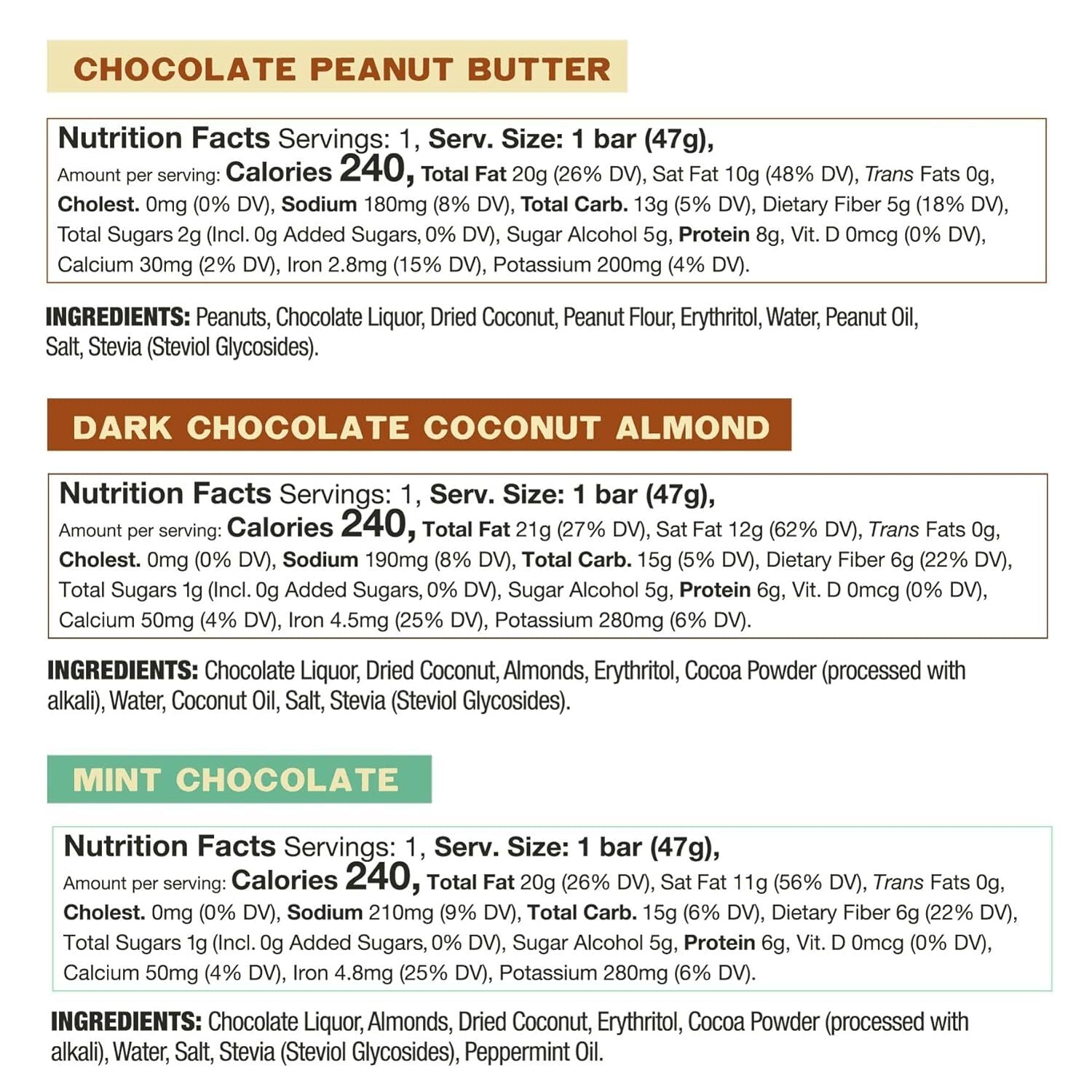 Real ingredients like chocolate, peanut butter, coconut, almonds, erythritol, peppermint oil, stevia, water, and salt, nothing artificial.